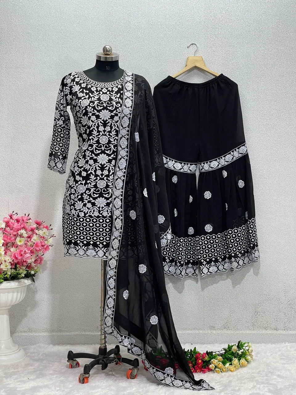 Designer Heavy Faux Georgette Top with Sharara Suit | Black/Blue/Green/Pink