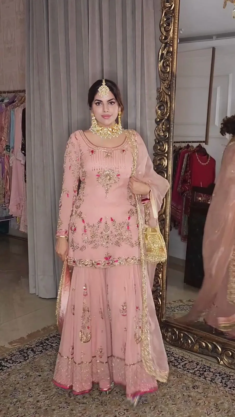 Fancy Embroidery and Sequins Work Kurta with Sharara and Dupatta | Pink
