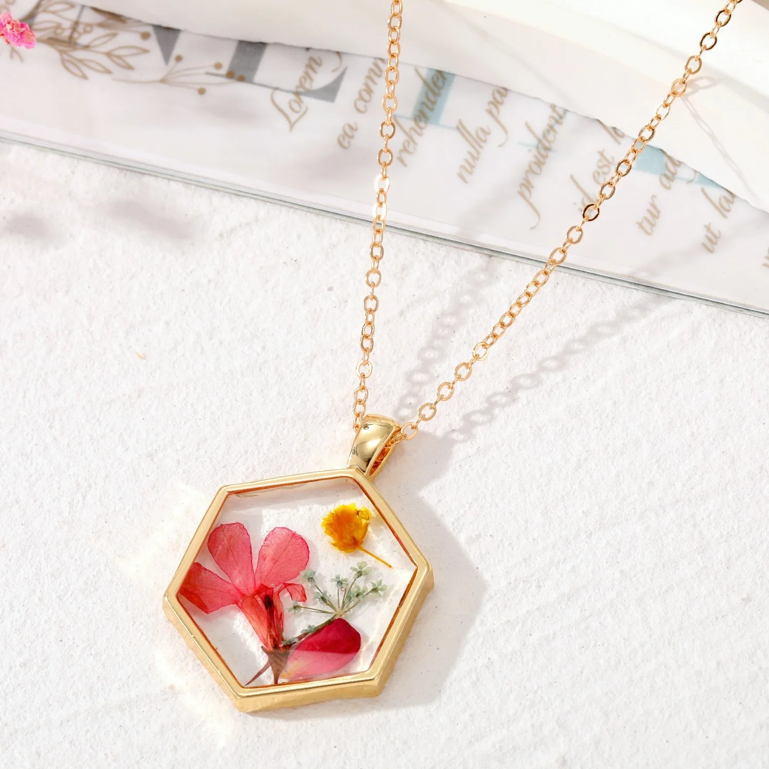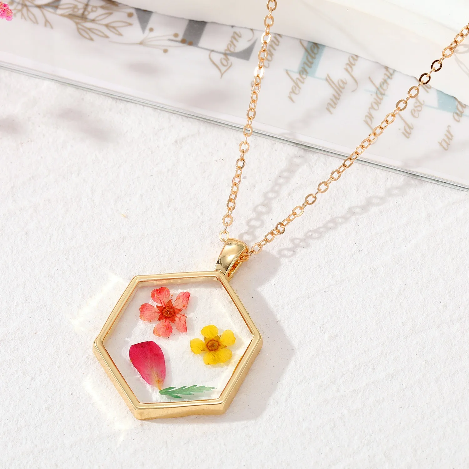 Women’s Bohemian Transparent Dried Flower Resin Necklace With Elegant Design | Eye-Catchy Trendy Necklace (Pink Green Yellow)