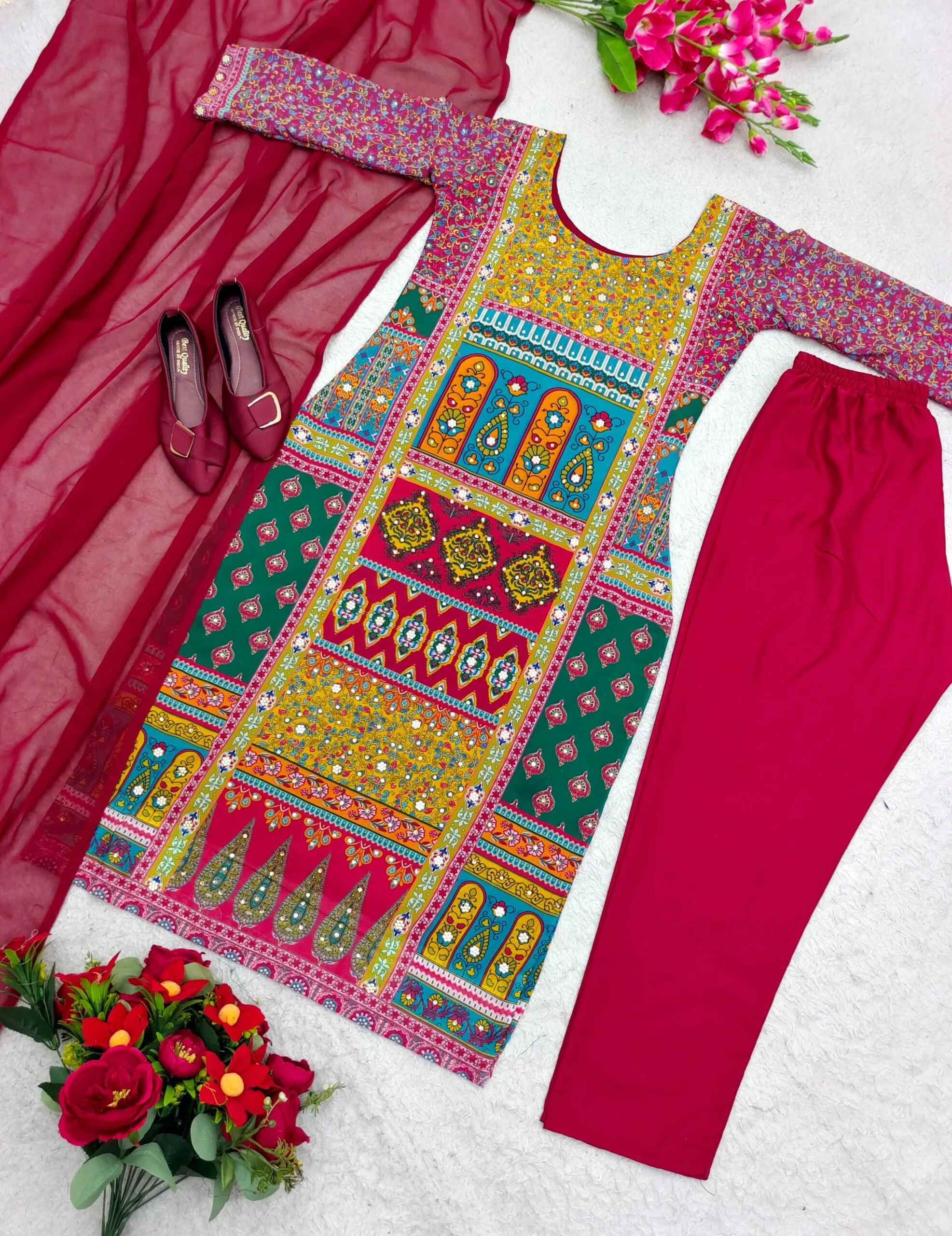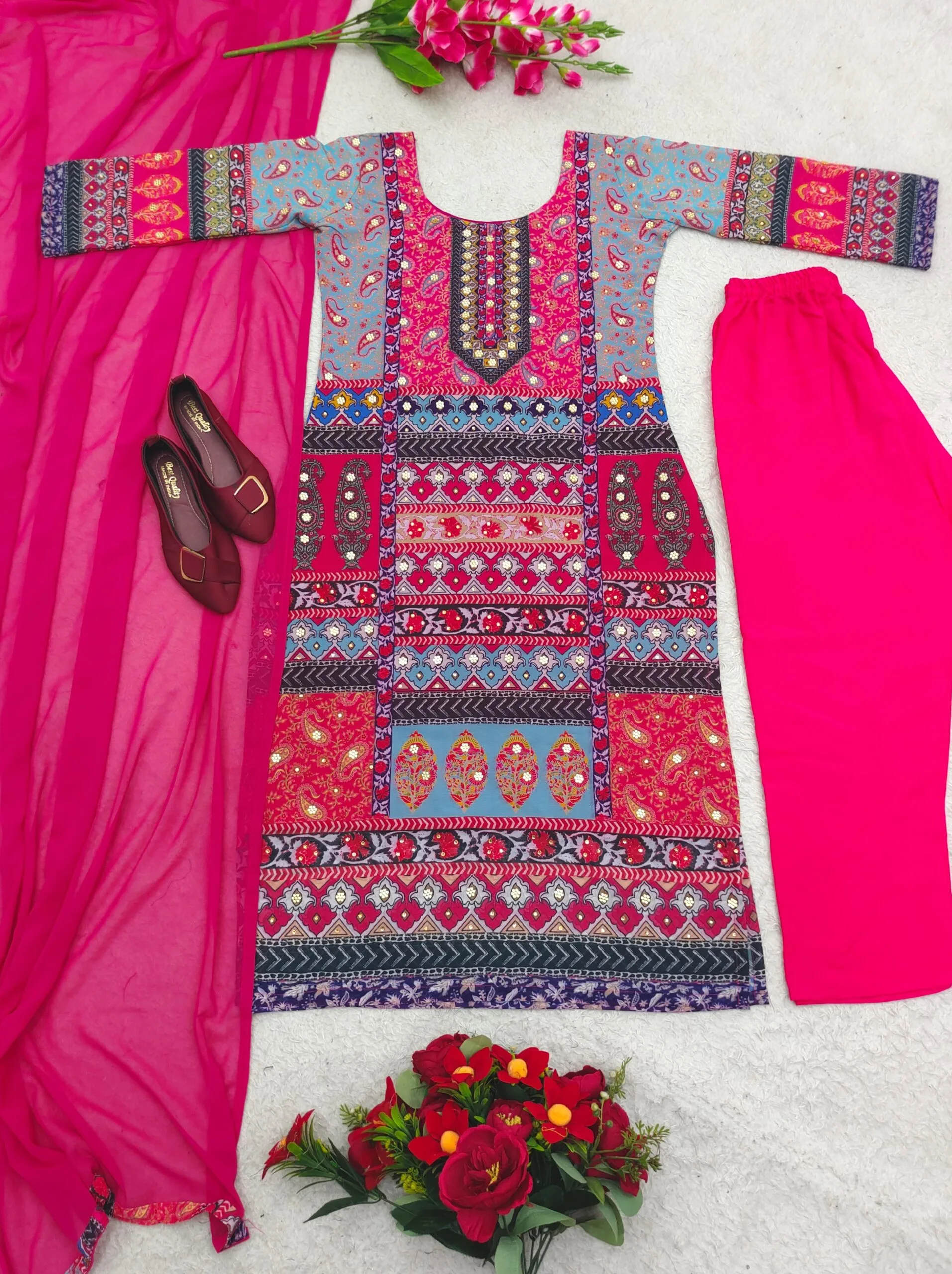 DETAILS :Suit: Fabric: Faux Georgette Size: M-38”, L-40”, XL-42”, XXL-44” Work: Cotton Thread with 9mm Sequin Embroidery Work Inner: Micro Height: 56” inchPant: Fabric: Faux Georgette Height: 38” inch Size: Free Size (Fully Stitched)Dupatta: Fabric: Butterfly Net Work: Border Lace Length: 2.1mWeight: 900gmhttp://azaayah.com/wp-content/uploads/2024/02/WhatsApp-Video-2024-01-24-at-19.51.46-1.mp4
